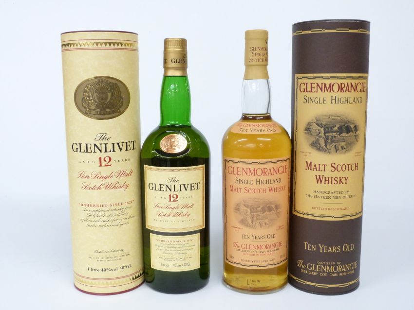 Glenlivet 12 year old Pure Single Malt Scotch Whisky, 1 litre, 40% vol and Glenmorangie 10 year old Single Highland Malt Scotch Whisky, 1 litre, 43% vol, both in presentation boxes