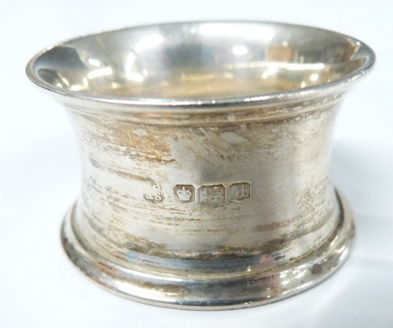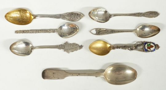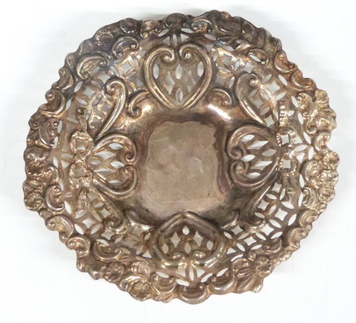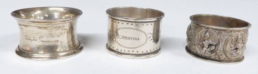Six souvenir spoons marked sterling, Victorian hallmarked silver pierced bon bon dish, Birmingham 1899, hallmarked silver teaspoon, hallmarked silver napkin ring, Indian or Burmese white metal napkin ring decorated with deities, 142g and a plated napkin ring