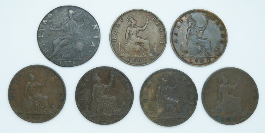 Six Victorian halfpennies, five for 1861 (three F and one VF) and one 1874 with defined masonry to lighthouse, VF, together with a George III 1775 halfpenny