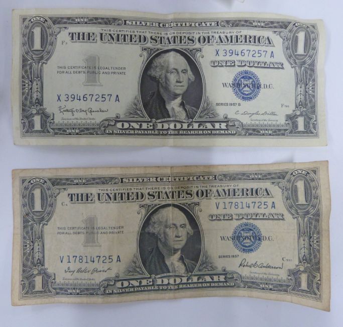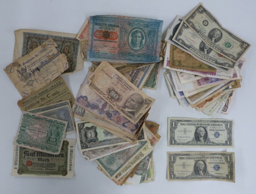 A collection of approximately 70 world banknotes, includes two USA silver $1 certificates