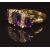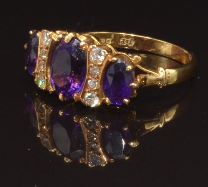 An 18ct gold ring set with three oval cut amethysts and diamonds, size L, 4.4g