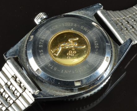 Wilson Super De Luxe skin diver gentleman's wristwatch with date aperture, luminous hands and hour markers, black dial, black bezel, stainless steel back and Constructa Watch Ltd one jewel movement, on stainless steel bracelet, case diameter 36mm, serial number 13824.
