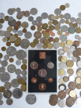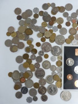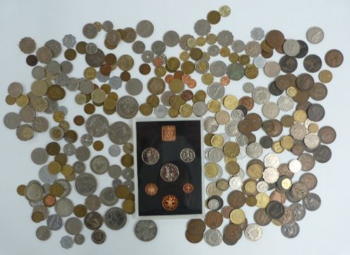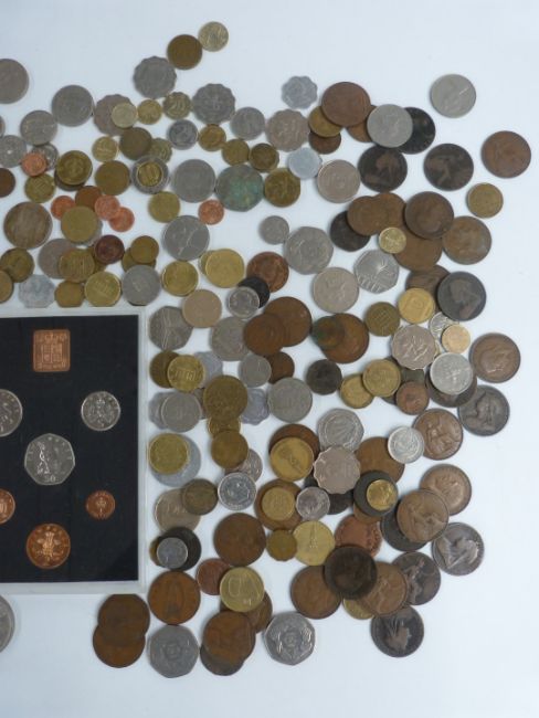 A collection of UK and overseas coinage, Victoria onwards, includes a silver content 1895 half crown and a 1971 UK proof set in a metal coin case