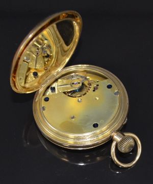 Unnamed 18ct gold keyless winding half hunter pocket watch with inset subsidiary seconds dial, blued hands, black Roman numerals, white enamel dial and inlaid blue enamel Roman numerals to the case, case diameter 48mm, serial number 1244, 107g.