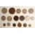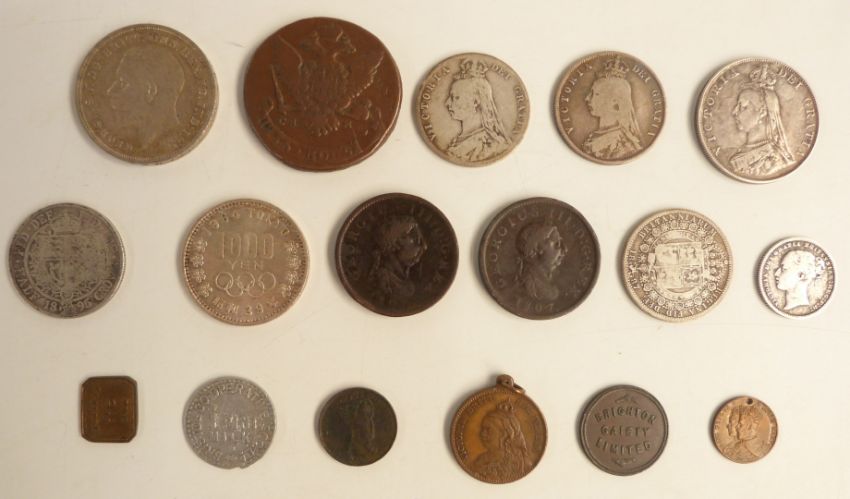 A small interesting group of coins and tokens etc, George III, Victoria and a Russian 1765 five Kopeks, Chinese one thousand Yen 1964 Olympic silver coin, two scruples apothecary weight, Brighton Gaiety Theatre token, rocking horse crown etc, all in an Edward VIII tin moneybox