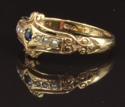 A 9ct gold ring set with a sapphire and seed pearls, size O, 2.8g