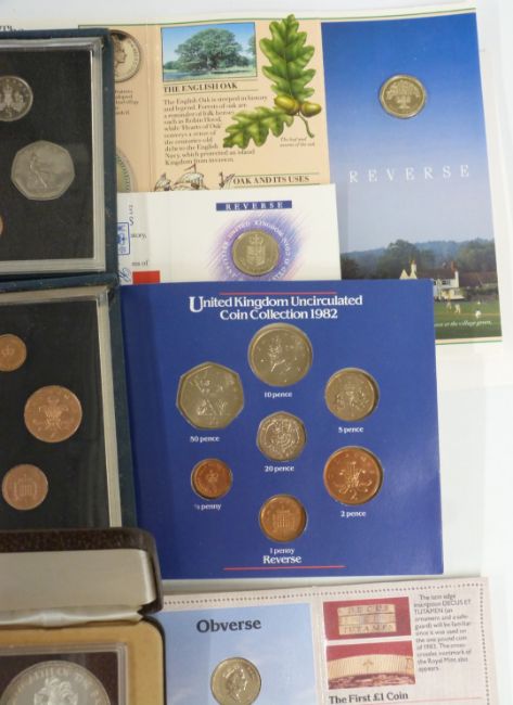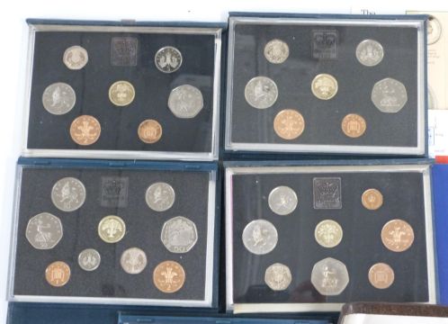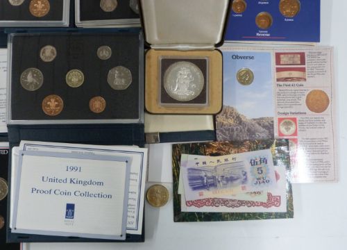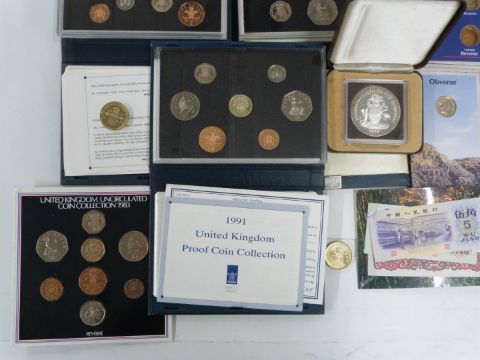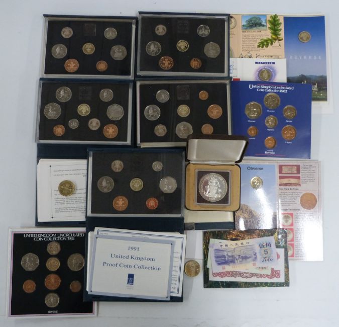 Royal Mint deluxe UK coin sets comprising 1984, 1985, 1987, 1991 and 1992, together with a silver 1978 Bahrain Prince Charles 10 dollar cased coin, most with certificates