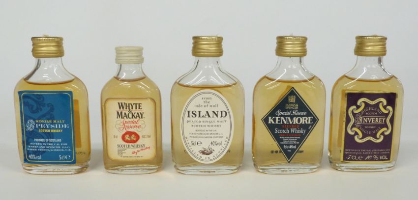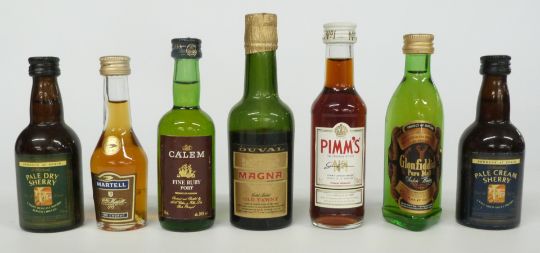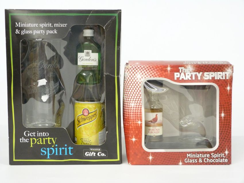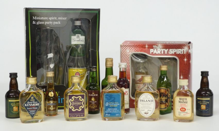 Twelve miniatures including Glenfiddich, Inverey and Isle of Mull whisky together with two gift sets, Gordon's Gin and Famous Grouse etc