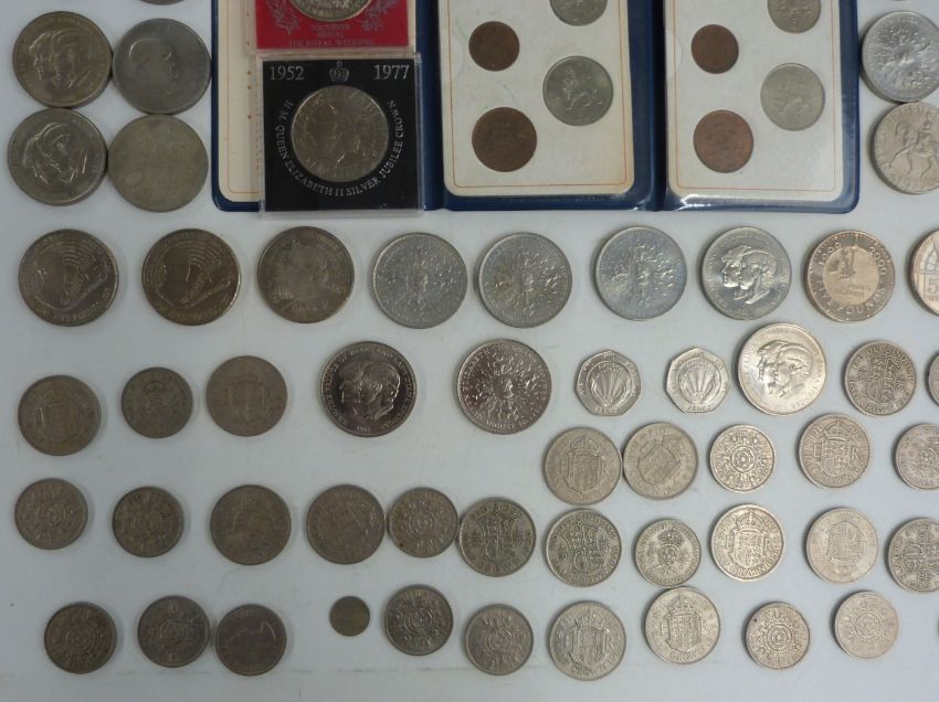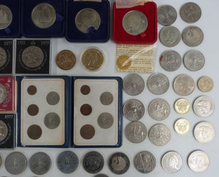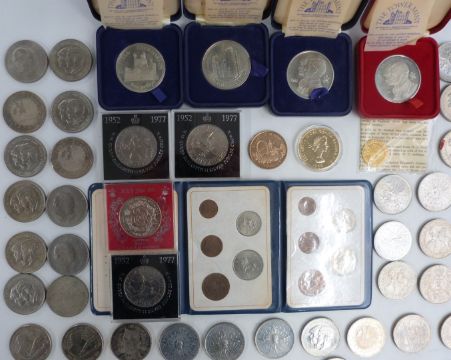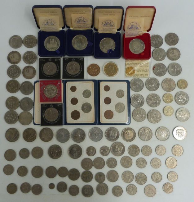 A large collection of modern crowns £5 and £2 coins together with some post-1947 UK half crowns and florins, some in cases, replica gold guinea etc