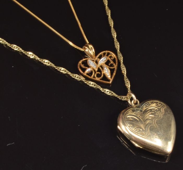 Two 9ct gold chains, a 9ct gold pendant, 3g, and a 9ct gold back and front heart locket
