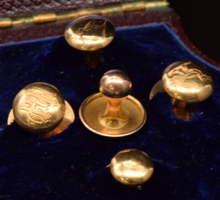 Four 18ct gold studs in Hunt & Roskell, late Storr & Mortimer box and another 18ct gold stud, 7.3g