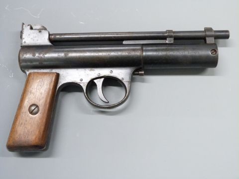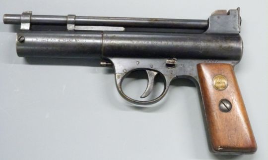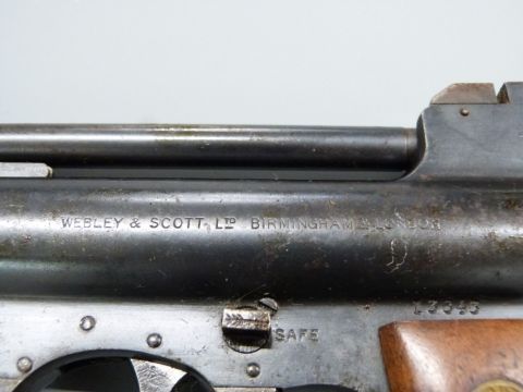 Webley Mark I .177 air pistol with maker's logo inset to the wooden grips and adjustable sights and trigger, serial number I3643.