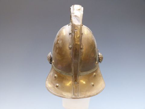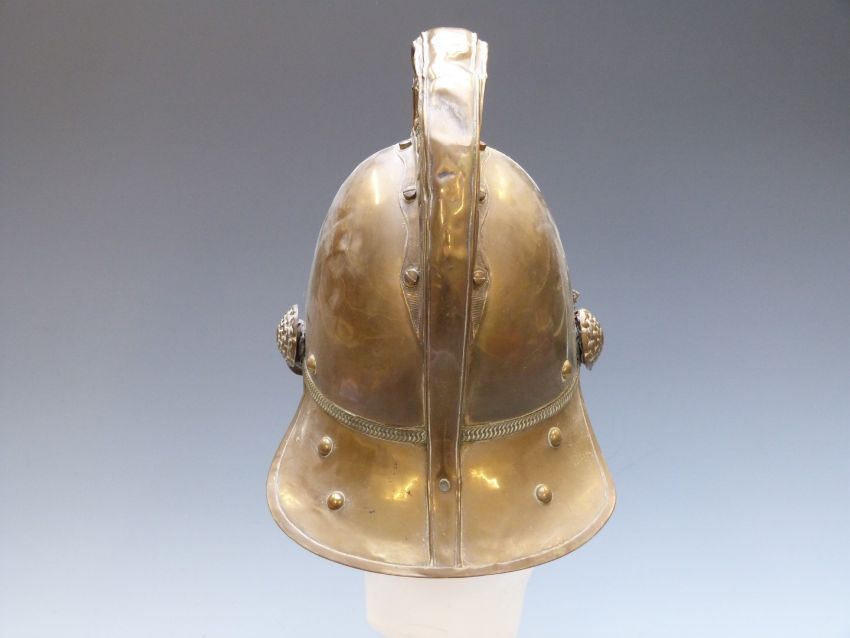 Brass Merryweather Fireman's helmet with crossed axes helmet plate, chin strap and liner