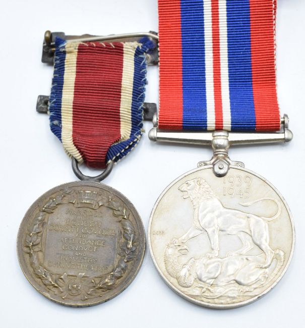 British Army WW2 War Medal with postal address box to E J Thaeder London together with a London County Council medal and German postcards etc