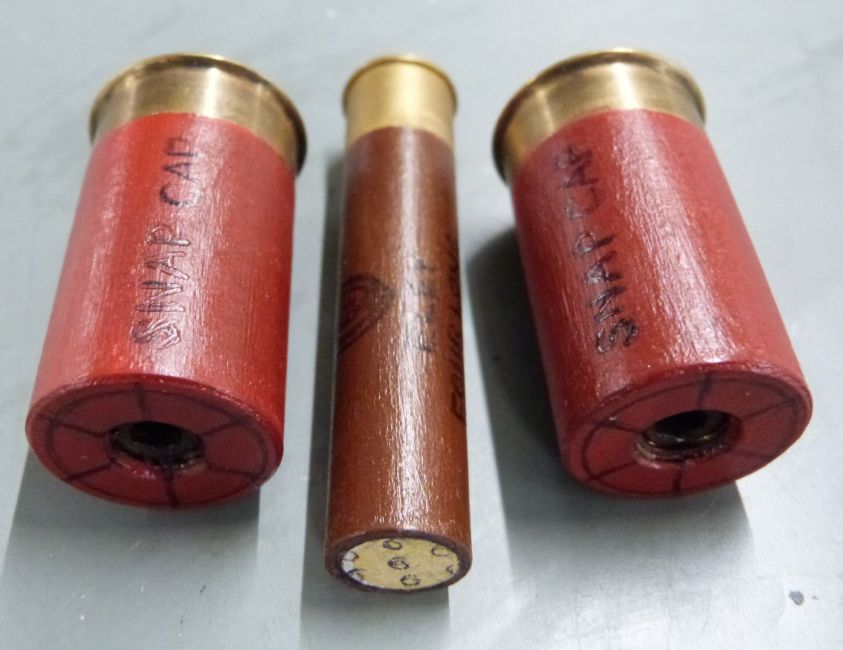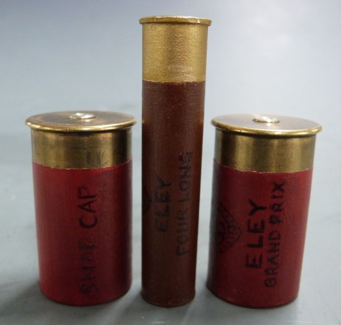 Three Eley hand painted dummy shotgun cartridges/ snapcaps.
