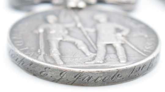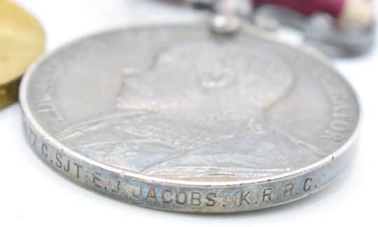 British Army Victorian and later group of six medals for WO2 Jacob, King's Royal Rifle Corps and 9th Battalion London Regiment, comprising India Medal 1896 with clasp for Relief of Chitral 1895 named to 7677 Cpl E J Jacob, 1st Battalion KRRC, Queen's South Africa Medal with clasps for Cape Colony, Talna, Defence of Ladysmith, Orange Free State, Laing's Nek and Belfast (6) and King's South Africa Medal with clasps for South Africa 1901 and South Africa 1902, both named to Sgt E Jacob KRRC, WW1 War Medal and Victory Medal, both named to 3275 WO2 E J Jacob, 9th London Regiment and his Edward VII Long Service and Good Conduct Medal, named to 7677 Colour Sgt E Jacob, KRRC, all with spare ribbons
