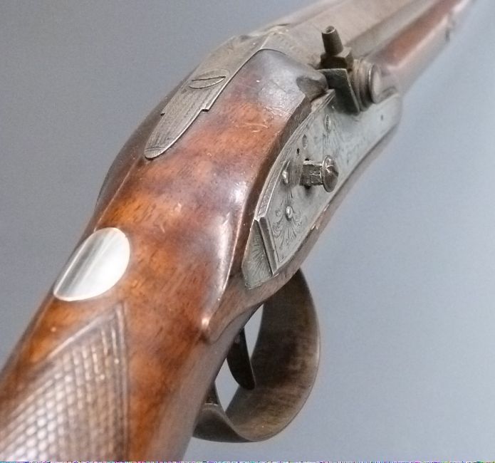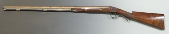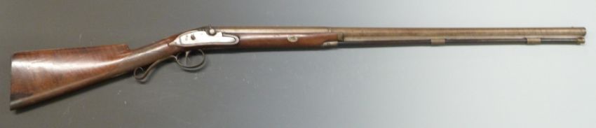 Joseph Simmons percussion converted from flintlock hammer action sporting gun with named and engraved lock, engraved scrolling trigger guard and top plate, chequered grip, horn tipped forend, brass tipped wooden ram-rod, vacant inset silver cartouche to the wrist and 31.5 inch part octagonal Damascus barrel with inset gold name plaque and barrel band, overall length 122cm.