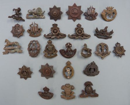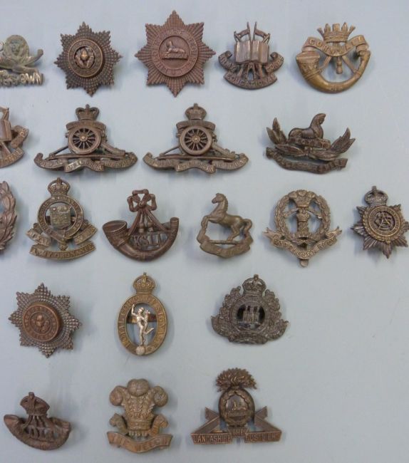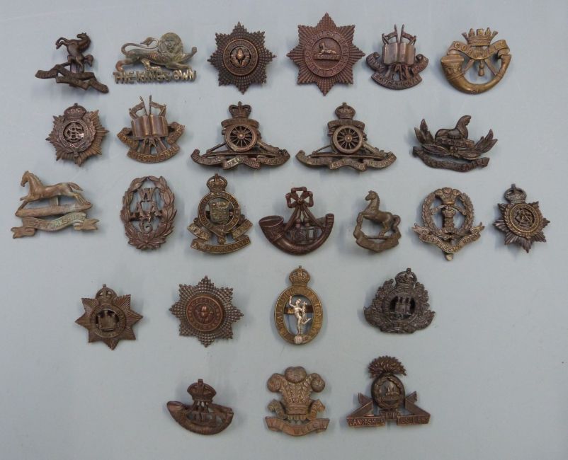 Approximately twenty five British Army Officer's Service Dress, cap and collar badges including Lancashire Fusiliers (J & Co), Durham Light Infantry, Welch Regiment (both by G R Gaunt), Cheshire Regiment, Royal West Kent Regiment, Linconshire Regiment etc