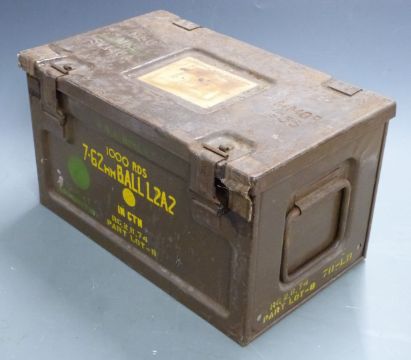 7.62mm metal ammunition box dated 1956 with folding handles, 45 x 27 x 26cm.
