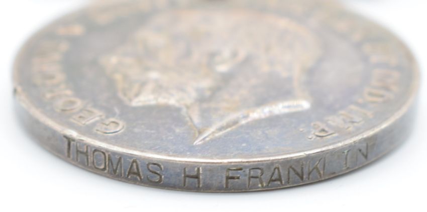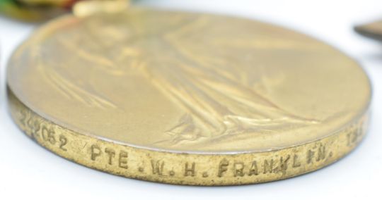 WW1 family medals for the Franklin family comprising 1914-1915 Star and Victory medal named to 20101 Pte S C Franklin Gloucestershire Regiment, Victory medal to 242025 Pte W H Franklin Queen's Regiment, War Medal and Mercantile Marine Medal to Thomas Franklin together with a presentation pocket watch inscribed 'To T Franklin from his friends at Malago 16/9/1938' and a baking medal