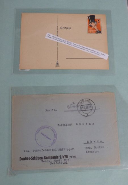 Album and scrapbook containing postcards, correspondence, envelopes, photographs, English, French and German WW1 and WW2 including British 1916 Tobacco Fund, early tank example, Field Ambulance etc