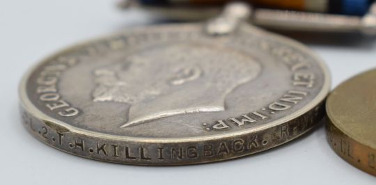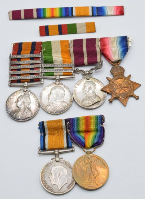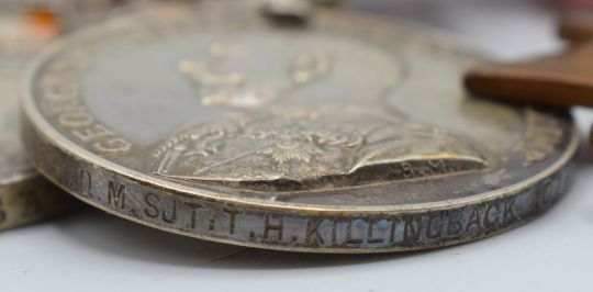 British Army Victorian and later Royal Welsh Fusiliers medal group of six for Warrant Officer Second Class T H Killingback comprising Queen's South Africa Medal with ghost dates and clasps for Tugela Heights, Relief of Ladysmith, Cape Colony, Transvaal and Orange Free State, King's South Africa Medal with clasps for South Africa 1901 and 1902, both to 2927 Sgt T H Killingback, Meritorious Service Medal (George V) to 15246 R.Q.M.S. T H Killingback, WW1 1914-1915 Star, War Medal and Victory Medal to 15246 WO CL 2 T H Killingback (Sgt to Star) with medal ribbon bar