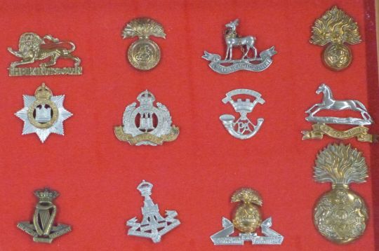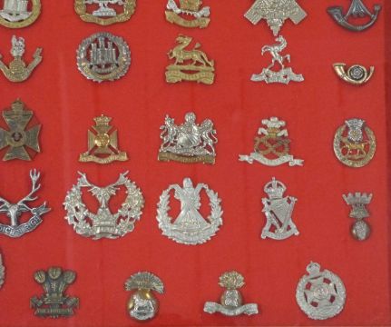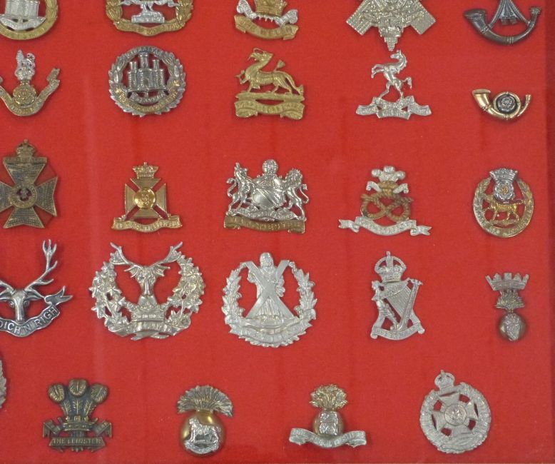 Seventy British Army cap badges including the Buffs, Suffolk Regiment, Royal Irish Regiment, Inniskilling, Border Regiment, East Surrey, Devonshire Regiment, Kings Shropshire Light Infantry etc, in glazed display