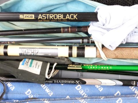 Coase fishing equipment, including nets float / ledger rods, Imoto fixed spool and reel and a large quantity of hooks in packets