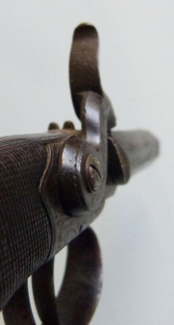 Reilly percussion hammer action pocket pistol with engraved lock, stylised dolphin hammer, trigger guard and top plate, chequered grip, vacant wrist cartouche and 3 inch turn off barrel engraved 'Reilly New Oxford St London', overall length 21cm.