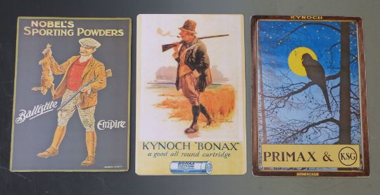 Three modern shotgun cartridge shop display or advertising boards Kynoch Bonax, Kynoch Primaz & KSG and Nobel's Sporting Powders, each 42.5x28cm.