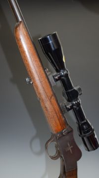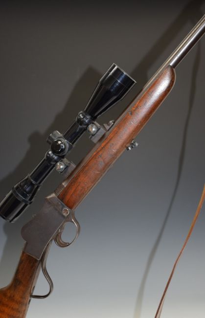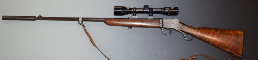 BSA .22LR Martini underlever action rifle with lock impressed 'BSA Trade Marks', leather sling, sound moderator, Original Model 12 wide-angle 4x40 scope and 31 inch barrel, overall length 117.5cm, serial number 43965. PLEASE NOTE THAT A VALID RELEVANT FIREARMS/SHOTGUN CERTIFICATE IS REQUIRED TO HANDLE/PURCHASE THIS ITEM.