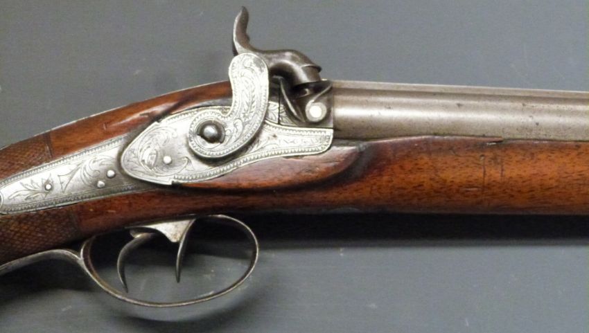 20 bore side by side percussion hammer action gun with stepped locks engraved with birds amongst scrolling decoration, engraved stylised dolphin hammers, scrolling trigger guard, top plate, mounts and butt plate, chequered grip and gold inlaid 30 inch Damascus barrels, overall length 116cm. The lock engraved 'Ingram' and possibly made for a member of the Ingram-Seymour-Conway Marquess of Hertford family.