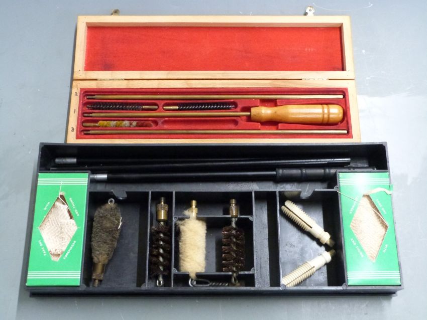 Parker Hale shotgun cleaning kit together with a rifle cleaning kit in fitted wooden box and a Tico Tool shotgun cleaner.