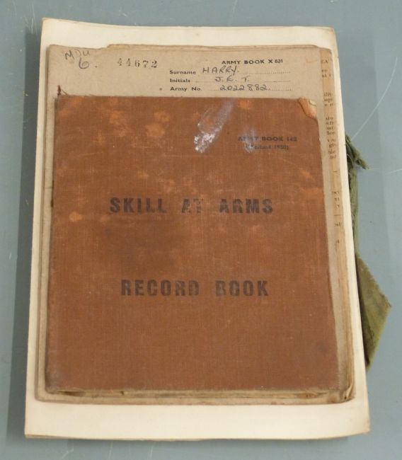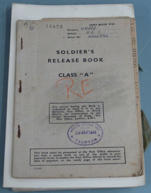 Collection of WW2 documents and publications, including RAF Handbook, Skill & Arms book, Soldier's Release book (2022828 J E Harry, RE) Civil Defence pamphlets etc