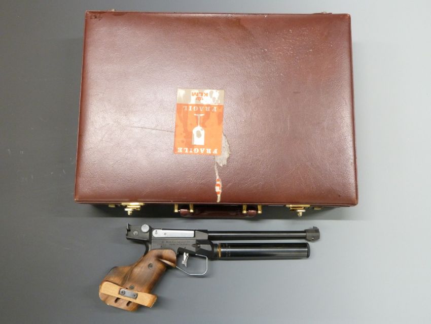 Feinwerkbau C10 .177 target air pistol with adjustable sights, grip and trigger, serial number 25780, in fitted carry case with spare cylinder and accessories.