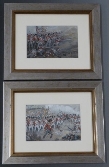 Two gouache paintings depicting the 48th Regiment of Foot (Northamptonshire Regiment) one 'Talevera 1809', the other 'Albuera 1811', both signed C Lawson. Frame 27 x 22cm