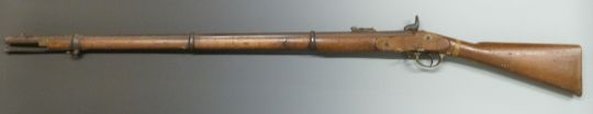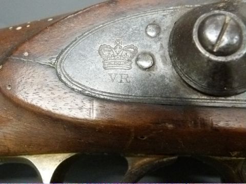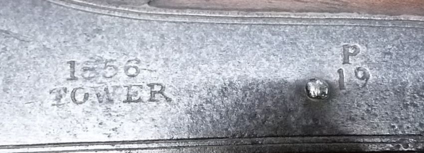 Enfield 1856 pattern percussion hammer action rifle with lock stamped with crown over 'VR' cypher and '1856 Tower', brass trigger guard and butt plate stamped, stock stamped 'Pimlico 1826 WO 2', pop-up ladder sights, steel ram-rod and 39 inch rifled barrel, overall length 140cm.