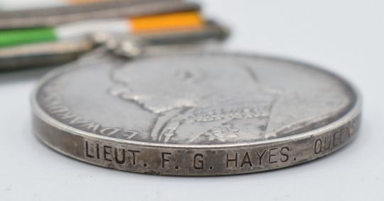 King's South Africa Medal with clasps for South Africa 1901 and South Africa 1902, named to Lieutenant F G Hayes, Queenstown Rifle Volunteers
