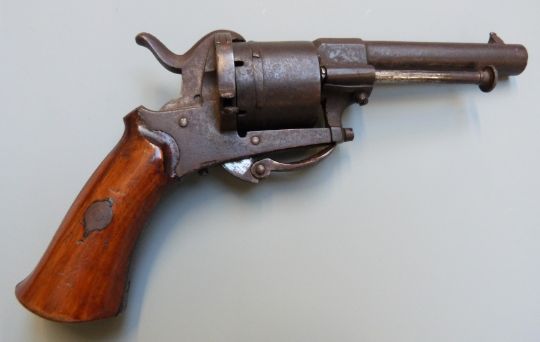 Belgian 6mm six-shot double action pinfire revolver with shaped wooden grips, folding trigger and 3.5 inch part octagonal rifled barrel, overall length 19.5cm.
