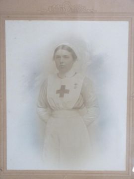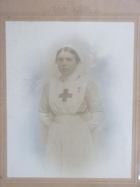 British Red Cross WW1 Volunteer Aid Detachment portrait of Miss Teresa M Fanin. Label verso reads: "Lost in the sinking of RMS Leinster by a German submarine on October 10th 1918. Presented by the Scottish Women's Hospital...", frame 43 x 53cm