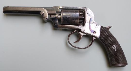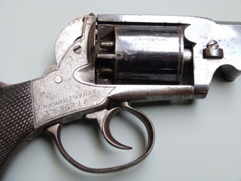 Webley style 80 bore five shot double action percussion revolver with frame engraved 'London Patent No 36244', chequered grip and 5 inch octagonal barrel, overall length 29.5cm.