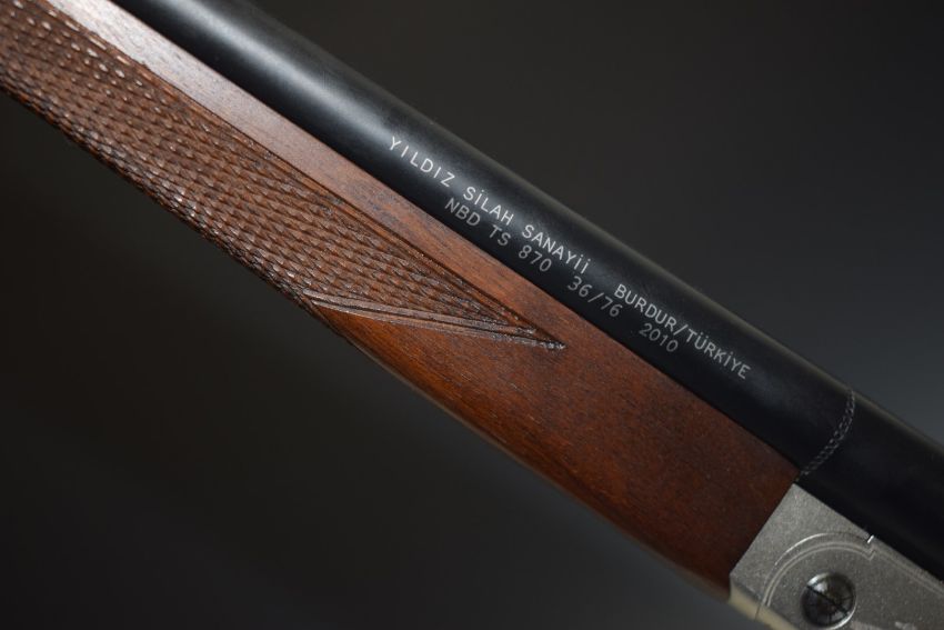 Yildiz .410 side by side shotgun with engraved scenes of birds to the lock and underside, engraved trigger guard and thumb lever, chequered semi-pistol grip and forend, single trigger, 3 inch magnum chambers and named 27.75 inch barrels choked ½ and ½, overall length 114cm, length of pull 36cm, serial number D5084.  PLEASE NOTE THAT A VALID RELEVANT FIREARMS/SHOTGUN CERTIFICATE IS REQUIRED TO HANDLE/PURCHASE THIS ITEM.
