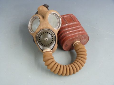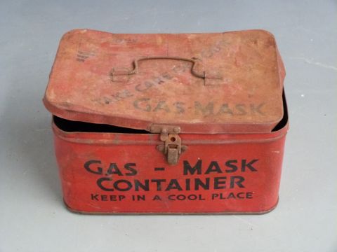 British WW2 gas mask by Avon dated 9/10/40 with broad arrow mark, two anti gas ointment containers and a A.R.P gas mask tin