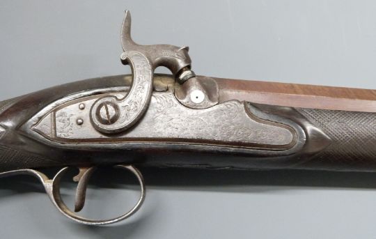 H W Mortimer percussion converted from flintlock hammer action sporting gun with named and engraved lock, engraved stylised dolphin hammer, trigger guard, top plate and mounts, brass tipped wooden ram-rod, chequered grip and horn tipped forend, and 32.75 inch part octagonal Damascus barrel, overall length 123cm.