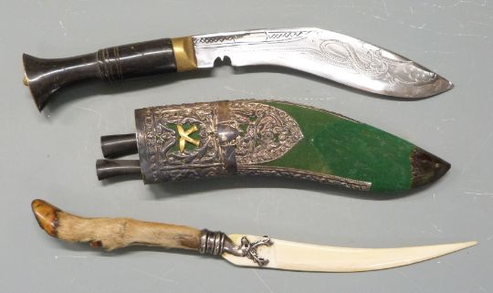 A deer slot paper knife with white metal mount in the form of a deer and a kukri, the scabbard with white metal mount 33cm. PLEASE NOTE ALL BLADED ITEMS ARE SUBJECT TO OVER 18 CHECK ON COLLECTION OR DELIVERY