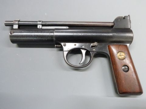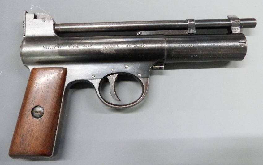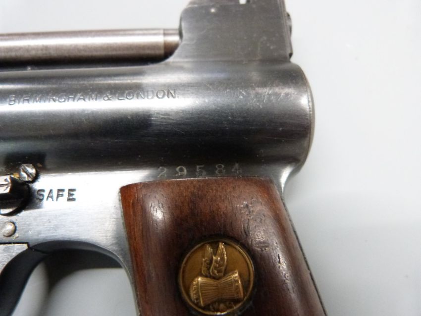 Webley Mark I 5th Series .177 air pistol with maker's logo inset to the wooden grips and adjustable sights and trigger, serial number 29584, in reproduction box with pellets.