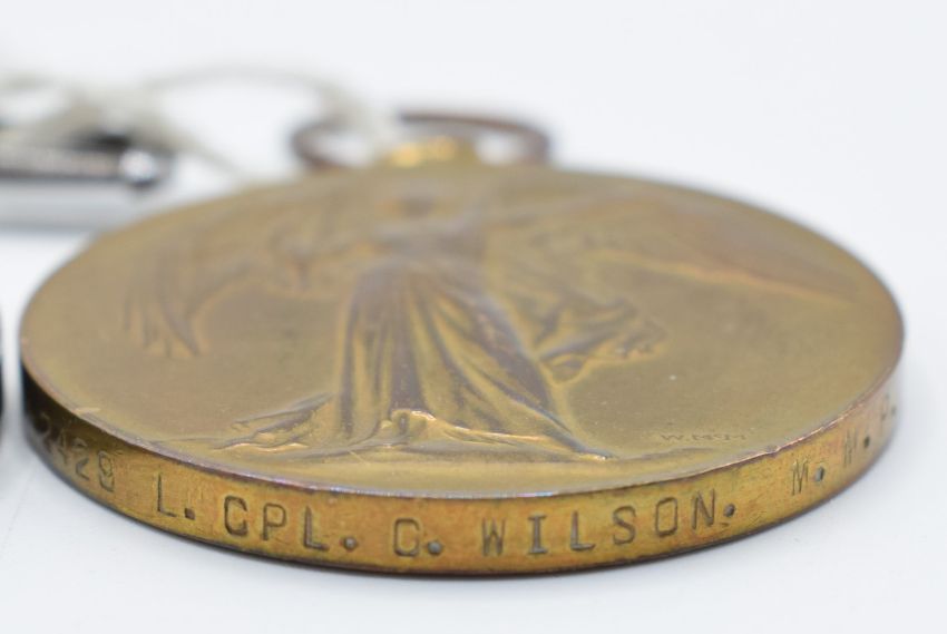 British Army WW1 medal pair comprising War Medal and Victory Medal both named to 2429 Cpl C Wilson Mounted Military Police, together with his St John's Ambulance Association silver medal, associated date tokens, watch chain and photograph