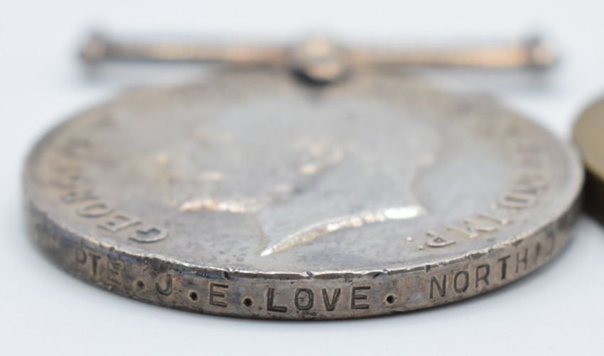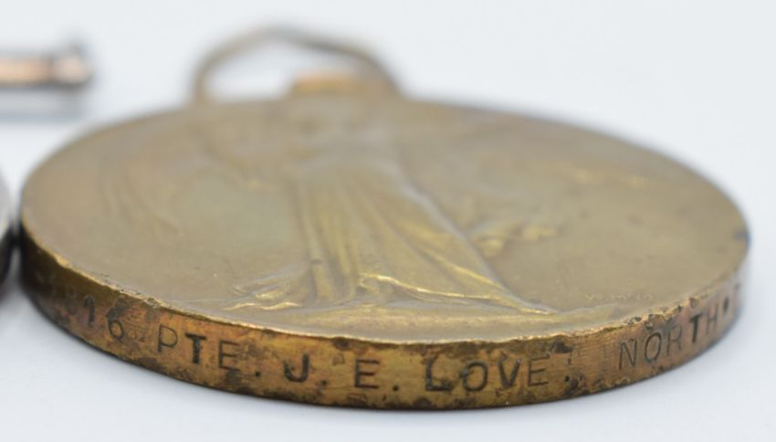 British Army WW1 War and Victory Medals, both named to 1816 Pte J E Love, Northumberland Fusiliers