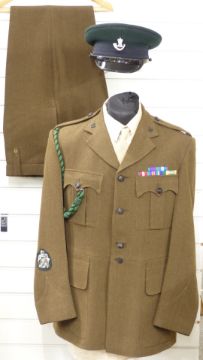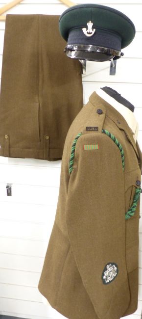 British Army the Rifles Regiment No2 Dress Uniform comprising tunic, trousers, shirt, tie and hat, the tunic with WOI rank badge, buttons, lanyard, shoulder titles etc, complete with mannequin stand