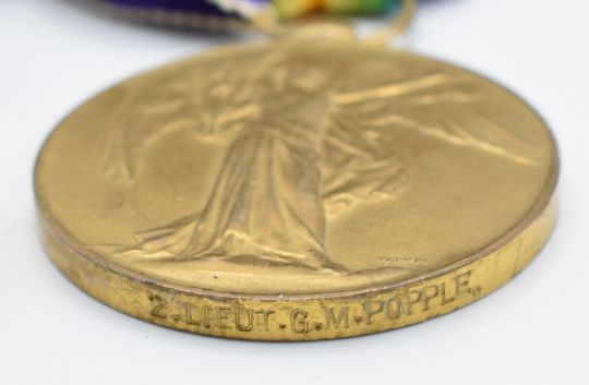 British Army WW1 medals comprising 1914-1915 Star, named to 1612 Pte G M Popple, East Kent Regiment, War Medal and Victory Medal, both named to 2nd Lieutenant G M Popple, together with two miniature paintings, both with leather cases. George Marsden Popple was attested on 1st of September 1914 and Gazetted on the 1st January 1916 to be temporary Second Lieutenant with the Northumberland Fusiliers. He died on 26th June 1916 aged 21 and is buried in the Authile Military Cemetery. With copy paperwork and research documentation.